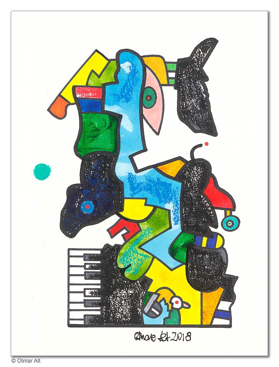 In seiner reduzierten aber expressiven Formensprache mit klar definierten Konturen schafft der Künstler Bilder, deren einzelne Komponenten puzzleartig verwoben sind (Erinnern an Hans Arp oder Joan Miro). Die starke Farbigkeit der Kunstwerke lassen sie im wahrsten Sinn des Wortes vor positiver Energie und Lebensfreude übersprudeln.