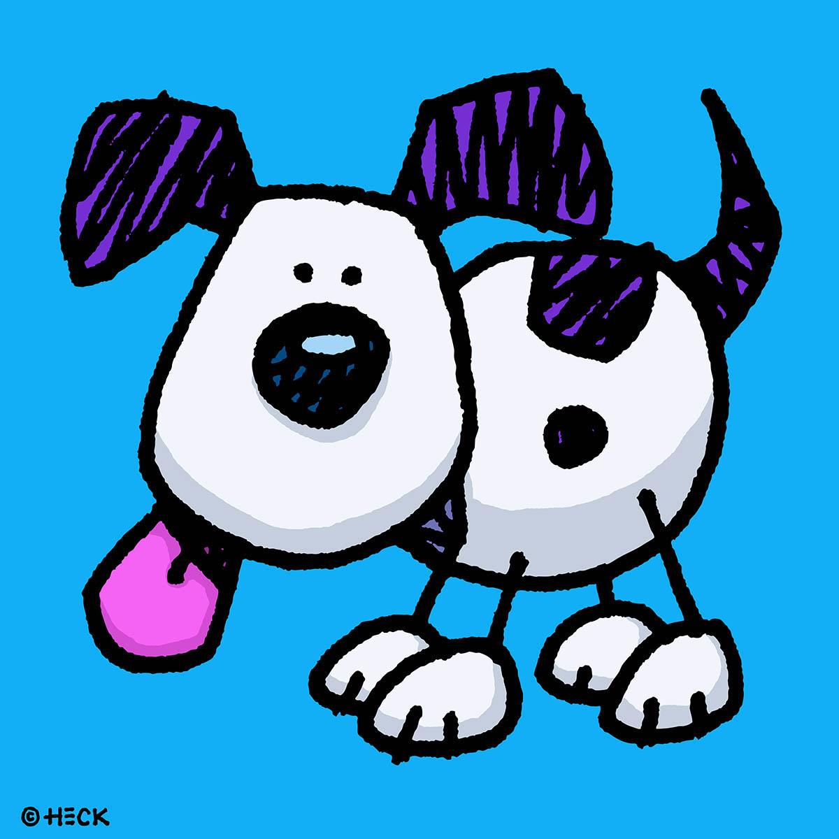 Rasch entwickelte Ed Heck sein Markenzeichen und Lieblingssujet: den weißen Hund mit großen schwarzen Flecken und langen schwarzen Ohren, dessen Hundeblick zuweilen etwas perplex und verwirrt erscheint - einen liebenswerten kleinen Kerl, der dem Betrachter ein Lächeln ins Gesicht zaubert. Dieser Hund, der vom Künstler eher zufällig auf einem Bild festgehalten wurde, hat sein lebendes Pendant im "Puggle" Max (eine Kreuzung aus Mops und Beagle), dem der Künstler ein Zuhause gab. Der beste Freund des Menschen bekommt bei Ed Heck menschliche Züge und wird daurch noch liebenswerter.
