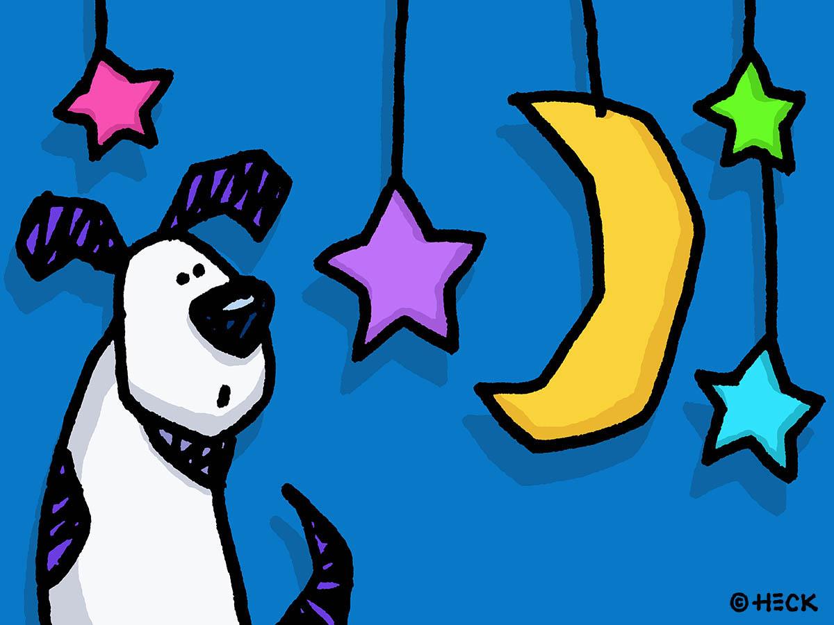 Rasch entwickelte Ed Heck sein Markenzeichen und Lieblingssujet: den weißen Hund mit großen schwarzen Flecken und langen schwarzen Ohren, dessen Hundeblick zuweilen etwas perplex und verwirrt erscheint - einen liebenswerten kleinen Kerl, der dem Betrachter ein Lächeln ins Gesicht zaubert. Dieser Hund, der vom Künstler eher zufällig auf einem Bild festgehalten wurde, hat sein lebendes Pendant im "Puggle" Max (eine Kreuzung aus Mops und Beagle), dem der Künstler ein Zuhause gab. Der beste Freund des Menschen bekommt bei Ed Heck menschliche Züge und wird daurch noch liebenswerter.